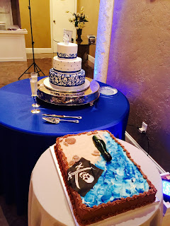 The ballroom was glowing with royal blue linens ,blue uplighting and silver charger plates.